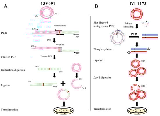 Mutant variants construction strategy for the infectious clone containing the full genome of the 13V091 strain (A) and IVI-1173 strains (B).