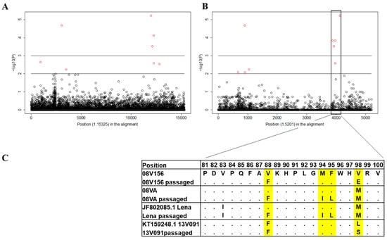 Manhattan plot with comparison results for Porcine reproductive and respiratory syndrome virus 1 (PRRSV1) full genome sequences on nucleotide (A) and amino acid (B) levels. Horizontal lines are plotted at p = 0.01 and p = 0.001 levels. (C) The fragment of the GP2a protein containing different amino acid residues in the wild-type and MARC-145 passaged strains.