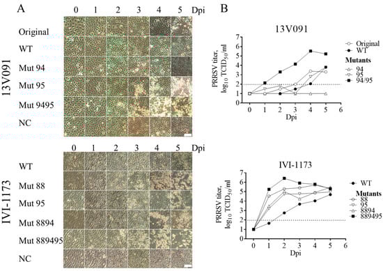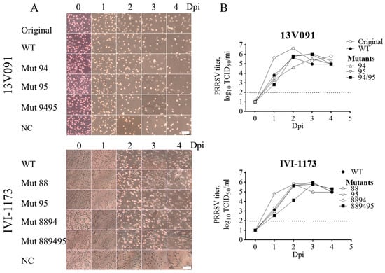(A) CPE in MARC-145 cells at 0–5 days post inoculation with the original 13V091 or rescued virus from the infectious clones (WT) and mutants of strains 13V091 and IVI-1173. Scale bar = 100 μm (B) Virus replication kinetics in MARC-145 cells. The dotted line represents the limit of detection for the assay.