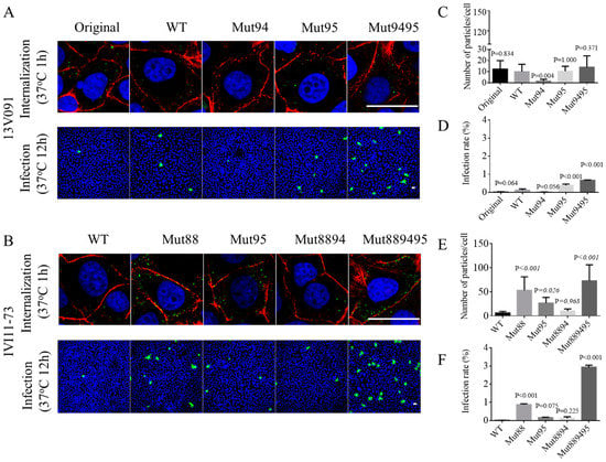 The virus entry assay for the recombinant PRRSV variants was performed with at least three replicates. The difference in the infection rate and number of internalized virus particles between the variants and WT was compared using a one-way analysis of variance (ANOVA) followed by Sidak’s multiple comparisons test. Differences were considered statistically significant at p < 0.05.