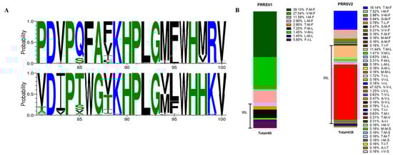 A graphical representation of an amino acid multiple sequence alignment of the GP2a protein (fragment covering amino acid residues at positions 81–100) from type 1 (n = 69) and type 2 (n = 638) PRRSVs (A). Logo image consists of stacks of symbols, one stack for each position in the sequence. The height of symbols within the stack indicates the relative frequency of each amino acid at that position [51]. (B) The percentage of different GP2a phenotypes were presented with bar charts for PRRSV1 and PRRSV2.