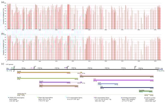 Deep sequencing of the bisulfite treated adeno-associated virus type 2 (AAV2) genomes. Vertical bars label the position of the CpGs in the AAV2 genomes in the diagrams: (a) Methylation values of the packaged AAV2 genome and the integrated AAV2 genome from total Detroit 6 DNA are represented by blue and red bars, respectively; (b) methylation values of the integrated AAV2 genome from purified chromosomal DNA; (c) the AAV2 genome and its transcription–translation map [15,16,17] is presented in scale showing the CpG-containing binding sites of transcription factors as well. The methylation-sensitive transcription factors are labelled by an asterisk.