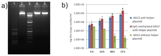 The result indicates that in vitro CpG hypermethylation of the viral genome does not inhibit its rescue from a plasmid. It also minimizes the possibility that helper rescue of integrated AAVs could be the result of the activation of incidentally existing un-methylated episomes [31,32] in these cells rather than the rescue of the integrated methylated genome. Hypermethylation has even a biologically minor but statistically significant positive effect (Figure 2b) on the output virus titers at 48 h and 72 h (p = 0.00058 and p = 0.00018).
