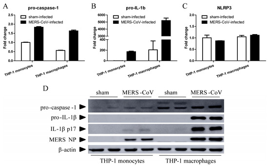 Unlike abortive infection of SARS-CoV in human macrophages, MERS-CoV can establish a productive infection in macrophages and induce production of proinflammatory cytokines and chemokines [18]. Many RNA viruses, such as EV71, H1N1, H7N9 influenza A virus, and Zika virus, can infect macrophages and trigger IL-1β secretion via the NLRP3 inflammasome [19,20,21,22]. To evaluate the response of macrophages to MERS-CoV infection, we inoculated THP-1 monocytic cells and THP-1 differentiated macrophages with MERS-CoV or RPMI 1640 medium (sham-infection). We then examined expression of NLRP3, pro-caspase-1, and pro-IL-1β 24 h later by RT-qPCR. As shown in Figure 1, MERS-CoV infection induced relatively higher expression of pro-caspase-1 (Figure 1A) and pro-IL-1β (Figure 1B), but not NLRP3 (Figure 1C), in both THP-1 monocytes and macrophages. Expression of pro-IL-1β in monocytes increased by 170-fold, whereas that in macrophages increased by 26-fold (on average).