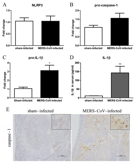 To determine whether MERS-CoV infection induces pyroptosis in mice, we used RT-qPCR to detect mRNA encoding NLRP3, pro-caspase-1, and pro-IL-1β in lung tissue from hDPP4 transgenic mice at Day 3 post-MERS-CoV infection. Although there was no significant difference in expression of NLRP3 and pro-caspase-1 between the sham-infected and MERS-CoV-infected groups (Figure 2A,B), expression of pro-IL-1β mRNA was significantly higher after MERS-CoV infection (Figure 2C). In addition, we measured the concentration of IL-1β in serum. The results showed that MERS-CoV infection induced production of IL-1β (Figure 2D). Furthermore, we examined expression of caspase-1 in the lung and spleen at Day 7 post-MERS-CoV infection by IHC. In line with the mRNA results, there was no significant difference in expression of caspase-1 in the lung of sham-infected and MERS-CoV-infected mice. However, the spleens of mice infected with MERS-CoV showed higher expression of caspase-1 than those of mice in the sham group (Figure 2E). The results indicated that MERS-CoV infection could induce pyroptosis in mice.