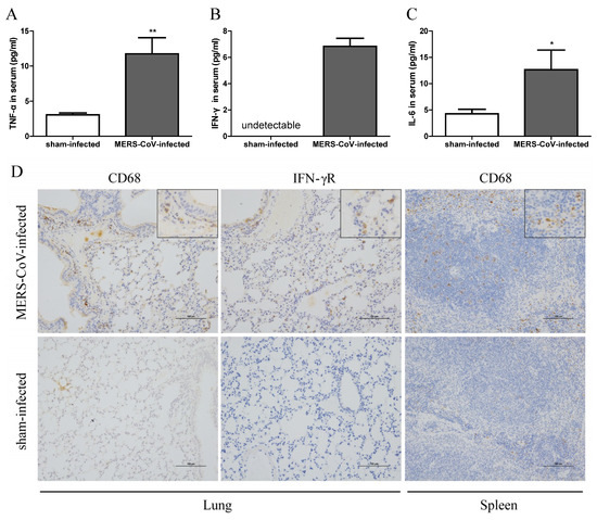 IL-1β plays an important role in mediating autoinflammatory diseases and in generating inflammatory responses to infection [23]. Therefore, to assess the inflammatory responses in mice, we measured TNF-α, IFN-γ, and IL-6 in serum at Day 3 post-MERS-CoV infection. As shown in Figure 3A–C, serum from mice in the MERS-CoV-infected group contained more TNF-α, IFN-γ, and IL-6 than that from sham-infected mice. IHC examination of CD68 and IFN-γ receptor expression also suggested greater macrophage infiltration and activation in the lung and spleen of mice at 7 days post-MERS-CoV infection (Figure 3D). These results indicate that MERS-CoV infection causes systemic inflammation, as reported in clinical MERS patients and MERS-CoV infected animal models [17,24].