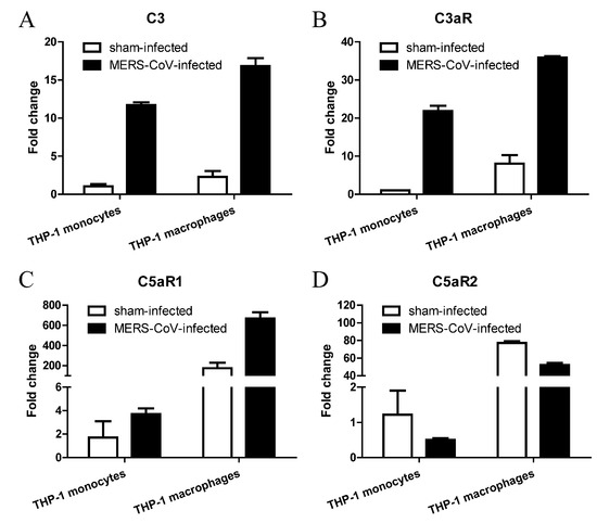 The complement system links activation of Toll-like receptors to transcription of IL-1β mRNA [25,26]. It has been studied that intracellular C3 is converted to biologically active C3a and C3b by the protease cathepsin L [27], and C3a activates NLRP3 and triggers IL-1β production in human monocytes by regulating efflux of ATP [28]. In addition, C5a is believed to induce a proinflammatory or anti-inflammatory response when ligated to C5aR1 or C5aR2 respectively [29,30,31]. Thus, we used RT-qPCR to examine expression of complement components and their receptors C3aR, C5aR1, and C5aR2. As shown in Figure 4, C3 and C3aR expression by both THP-1 monocytes and macrophages was highly upregulated (by 5–20-fold) after MERS-CoV infection. C5aR1 was upregulated, whereas C5aR2 was downregulated, after MERS-CoV infection.