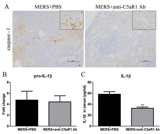 Blocking the C5a-C5aR1 axis reduces pyroptosis in hDPP4-transgenic mice. (A) Representative images of immunohistochemical staining of caspase-1 in lungs from PBS-treated and anti-C5aR1 Ab-treated groups on Day 7 post-challenge (scale bars = 100 μm). (B) Transcription of pro-IL-1β in lung tissues from PBS-treated and anti-C5aR1 Ab-treated groups at Day 7 post-infection (n = 4–5 per group). (C) Concentration of IL-1β in serum at Day 1 post-MERS-CoV infection. Data are expressed as means ± SEM (n = 4–5 per group). ** p < 0.01 (Student’s t test with Welch’s correction).
