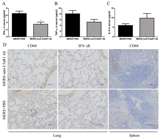 At 1 day after MERS-CoV infection, we measured proinflammatory cytokines (IFN-γ, TNF-α, and IL-6) in serum. IFN-γ levels in mice treated with the anti-C5aR1 Ab were much lower than those in the PBS-treated group (Figure 6A). To further evaluate the effect of complement inhibition on the local inflammation at later time after MERS-CoV infection, we examined expression of CD68 and IFN-γ receptor in lung and spleen at 7 days post-MERS-CoV infection. IHC revealed that macrophage infiltration and activation were lower in the anti-C5aR1 Ab-treated group (Figure 6D). Taken together, these results suggest that inhibiting complement dampens the over-activated inflammatory response in mice infected with MERS-CoV.