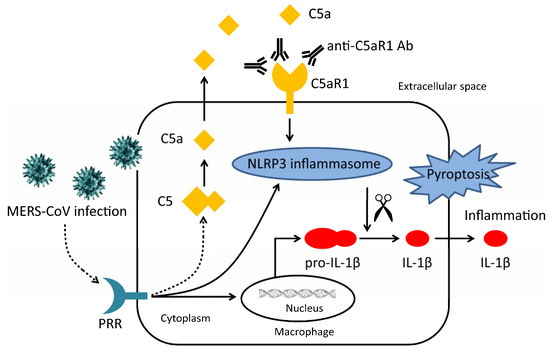 Although many studies have focused on the link between complement and pyroptosis, the pathways that link them remain unclear. Here, our results showed that MERS-CoV infection induces pro-IL-1β transcription, and complement activation, which leads to pyroptosis in macrophages. Induction of pyroptosis was related with complement activation and may be promoted by ligation of C5a and C5aR1, which was confirmed by the blockade of anti-C5aR1 antibody (Figure 7).