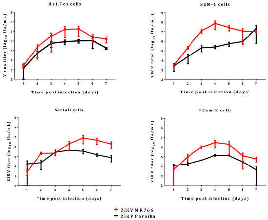 All the cells we tested were permissive to both ZIKV MR766 and ZIKV Paraiba, but the former replicated to higher titers than the clinical isolate (Figure 1). These results suggested that any of the testicular cells may be responsible for disseminating virus in the infected organ. However, Leydig cells were reportedly less susceptible to ZIKV infection [27], and their role in virus dissemination may be limited. The higher replication levels of ZIKV MR766 could be related to the fact that this strain has been passaged extensively in mouse brains [1,30]. In addition, ZIKV MR766 and ZIKV Paraiba are 89% identical at nucleotide sequence level and 97% (3313/3423) identical at amino acid level (BLAST; https://blast.ncbi.nlm.nih.gov/Blast.cgi). Thus, the ZIKV MR766 strain may have adapted to mammalian cell culture better than the ZIKV Paraiba strain which was passaged only <5 times. However, replication kinetics of ZIKV Paraiba and ZIKV MR766 in Vero E6 cells is similar from 24 to 60 hpi, but ZIKV MR766 replicates to higher titers from 72 to 96 hpi [31]. Therefore, the MR766 replication advantage may be time and cell-type dependent.