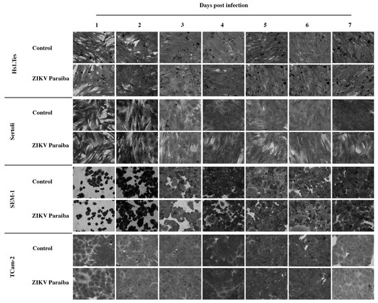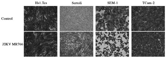 Cytopathic effect of ZIKV MR766 on testicular cell lines at 7 dpi. We noted that ZIKV MR766-infected Sertoli and SEM-1 cells appeared smaller than uninfected controls. TCam-2 and Hs1.Tes cells did show any CPE at 7 dpi. Images were obtained at a magnification of 400×.