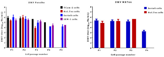 ZIKV titers in persistently infected testicular cell lines. The clinical isolate ZIKV Paraiba was able to persist in all cell lines tested for up to 5 passages (P1 through to P5), depending on cell line. ZIKV MR766 was only able to persist in Sertoli and Hs1.Tes cells. Virus titration was performed using supernatants collected at the end of each 7-day period and each data point represents an average of 3 biological replicates. Error bars represent standard deviation from the mean. Each passage was done after 7 days by washing the monolayer twice with PBS, trypsinizing the cells and seeding into new flasks with fresh culture medium at 1:10.