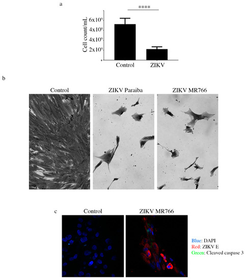 Analysis of continued cell death in ZIKV-infected testicular cells. (a) Cell count graph showing that there were 2-times more cells in the uninfected Hs1.Tes control, compared to ZIKV Paraiba-infected Hs1.Tes cells at P1. For both control and ZIKV-infected cells, the count was done after 7 days of cell passage. ****, p < 0.0001 (unpaired t-test). (b) Microscopic images showing loss of the Hs1.Tes monolayer in ZIKV-infected cells at P3. The morphology of infected cells at this time point appeared grossly aberrant and pleomorphic when compared to that of uninfected control cells. Cells were imaged at a magnification of 400×. (c) Confocal microscopy images showing cleaved caspase 3 in some ZIKV-infected Sertoli cells at P1. Not all ZIKV E protein-expressing cells stained positive for cleaved caspase 3, supporting the notion that cell death in persistently infected cells was progressive. Cells were imaged at a magnification of 400×.