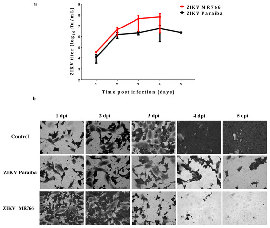 ZIKV infection in a human neuroblastoma SK-N-SH cell line. (a) Replication kinetics of ZIKV MR766 and Paraiba strains in SK-N-SH cells. Error bars represent SD from the mean for 3 independent experiments. (b) Cell death in SK-N-SH cell monolayers infected with ZIKV Paraiba or ZIKV MR766. ZIKV MR766 was more aggressive at killing SK-N-SH cells. Images of the SK-N-SH monolayer were acquired at a magnification of 400×.