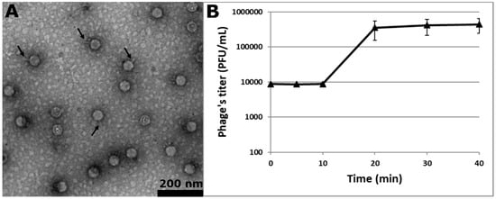 Starting from a large clear plaque, virions were resuspended in 1 mL of SM buffer (Tris-HCl 10 mM pH 7.5, MgSO4 10 mM, NaCl 300 mM) and the suspension was centrifuged 10 min at 7500× g and room temperature. Phage titer in the supernatant was determined by preparing serial dilutions in SM buffer and using the double overlay method. High-titer phage stock was obtained as previously described [] with slight modifications. Five hundred to one thousand phages were plated using the double overlay method, which led to a confluent lysis after 12 h at 37 °C. The plate was then flooded with 5 mL of SM buffer and incubated 2 h at 4 °C. The overlay was carefully collected and centrifuged 20 min at 7500× g at room temperature and the phages-containing supernatant was passed through a 0.45 µm filter. Phage stocks were titrated (~1011 PFU·mL−1) and stored at 4 °C for further experiments. Ten milliliters of filtered phage stock was incubated 12 h at 4 °C under stirring in the presence of NaCl 1M and PEG 8000 10 %. Precipitated phages were then centrifuged 20 min at 10,000× g and 4 °C and slowly resuspended in 1 mL of SM buffer for 1 h at 4 °C prior to be purified by centrifugation in a CsCl buoyant gradient. The purified phage-containing fraction was then recovered (density 1.4), titrated and stored at 4 °C for further experiments.