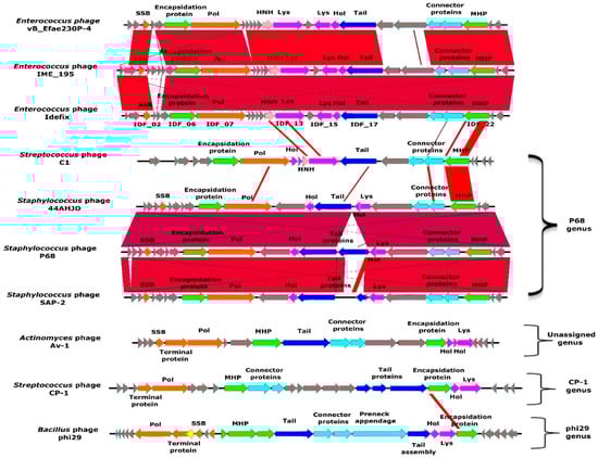 Annotation and comparison of the phage Idefix genome. Enterococcus phage genomes from vB_Efae230P-4, vB_EfaP_IME195, and Idefix compared to Streptococcus phage C1, Staphylococcus phages 44AHJD, P68, SAP-2, 66, Actinomyces phage Av-1, Streptococcus phage CP-1 and Bacillus phage phi29 all belonging to the Picovirinae subfamily. Gene functions are color-coded and detailed (yellow: transcriptional regulation, orange: DNA metabolism, green: DNA packaging and head, light blue: head to tail, dark blue: tail, pink: HNH endonuclease, fuchsia: lysis, grey: hypothetical proteins).