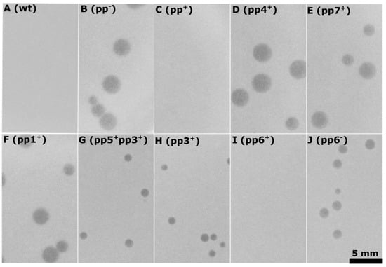 V583 endogenous prophages (pps) interference with Idefix infection, plaque assays performed on strains: A. wt (VE14002), V583 clinical isolate. B. pp- (VE18590), a V583 derivative deleted for all its plasmids and prophages. C. pp+ (VE14089), a V583 derivative only deleted from all its plasmids. D. pp4+ (VE18582), a VE14089 derivative deleted for all its pps but pp4. E. pp7+ (VE18589), a VE14089 derivative deleted for all its pps but pp7. F. pp1+ (VE18562), a VE14089 derivative deleted for all its pps but pp1. G. pp3+pp5+ (VE18583), a VE14089 derivative deleted for all its pps but pp3 and pp5. H. pp3+ (VE18584), a VE14089 derivative deleted for all its pps but pp3. I. pp6+ (VE18581), a VE14089 derivative deleted for all its pps but pp6. J. pp6− (VE18306), a VE14089 derivative only deleted from pp6.