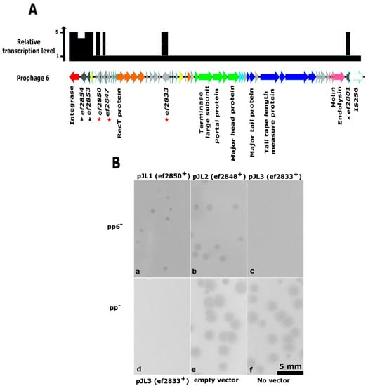 To search for prophage 6 candidate genes involved in this Abi mechanism, we analyzed transcriptomic data of strain pp+ []. Eight of the prophage 6 encoded genes are expressed constitutively during normal growth conditions, in contrast to the generally low expression level of the remaining 50 genes carried by the prophage (Figure 4A). Two of these genes, ef2855 and ef2852, encode the integrase and repressor proteins, which are implicated in the lysogenic control of the prophage. Between these two genes, and probably forming an operon with them, genes ef2854 and ef2853 encode a putative membrane protein and a putative metallo-peptidase, respectively. A similar gene pair, placed between an integrase and a repressor, is found in several Sie prophage-encoded phage resistance systems within the Lactococcus genus [,]. These systems block the phage DNA injection step, due to the membrane protein. The nearby metallo-peptidase is dispensable, but sometimes enhances the resistance efficiency [,]. Given that Sie systems do not affect bacterial survival, we did not consider the gene pair ef2853 and ef2854 as responsible for the observed resistance to Idefix infection. Among the four last candidate genes, ef2801 is disrupted by a transposable element invalidating a putative glycosyltransferase, so that our investigation was restricted to the three remaining genes ef2833, ef2847, and ef2850.