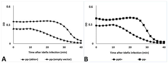 Lysis curves after Idefix infection at MOI 10. (A) Comparison between pp−pJIM2246abiα+ (VEJL5) and pp− pJIM2246 (VEJL4) in triangles and diamonds, respectively. (B) Comparison between pp6+ and pp− in circles and squares, respectively. The results shown are representative of three biological replicates (see Figure S5).