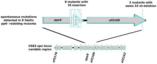 Genomic organization of V583 variable epa locus and focus on spontaneous mutations found in epaX region for nine Idefix pp6− resisting mutants.