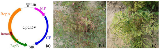 (a) Schematic diagram of the CpCDV genome representing virion and complementary open reading frames, Movement protein (MP), Capsid protein (CP), and Replication associated protein A and B (RepA and RepB), LIR and SIR—large and small intergenic regions. Intron and stemloop region are indicated. Chickpea plants showing (b) leaf reddening and (c) leaf smalling; stunting and proliferation of axillary shoot.
