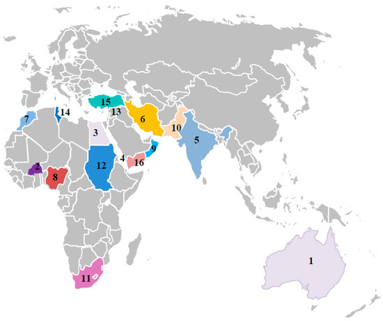 Geographical distribution of dicot infecting mastreviruses across the old world. 1. Australia- CpCAV, CpCV-A,B,C,E,F, CpRLV, CpYV and TYDV; 2. Burkina Faso- CpCDV-Q,R; 3. Egypt- CpCDV-A, 4. Eritrea- CpCDV-C,D,E,F,H,I,K,M,N,O,P; 5. India-CpCDV-C,D; 6. Iran- CpCDV-A; 7. Morocco- CpCDV-D; 8. Nigeria- CpCDV-S; 9. Oman- CpCDV-F; 10. Pakistan- CpCDV-B,C,D,F,H,I, CpYDV; 11. South Africa- CpCDV-B; 12. Sudan- CpCDV-C,D,E,F,H,I,K,M,N,O,P; 13. Syria- CpCDV-A,F; 14. Tunisia- CpCDV-A,H; and 15. Turkey- CpCDV-A; 16. Yemen- CpCDV-F.