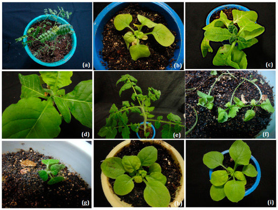 N. benthamiana infected with clones CpCDV-A showed typical symptoms of yellowing, stunting, and crumpling of newly emerging leaves [24,55]. With CpCDV-B inoculation on N. benthamiana, N. tabacum, L. esculentum, D. stramonium, and A. thaliana plants became stunted, leaves developed interveinal chlorosis, and they exhibited severe downward curling symptoms [21]. Inoculation of CpCDV-C on N. benthamiana resulted in intense yellowing and downward leaf curling (Figure 3b) [14]. N. glutinosa showed severe stunting, small thick green leaves, and backward curling of apical leaves followed by a reduction in shoot elongation (Figure 3c) [14], and N. tabacum resulted in reduced apical leaves, dark green color, and downward leaf curling (Figure 3d) [14]. Young unfurling leaves became thick, dark green, and had mild backward leaf curling in CpCDV-C agroinoculated tomato plants (Figure 3e) [14]. Chickpea plants showed foliar yellowing and reduced leaf size, and plants were stunted [13].