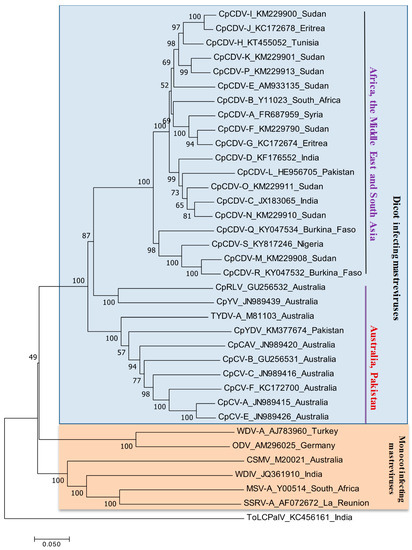 Dicot-infecting mastreviruses are widely distributed in the chickpea-growing regions of the world, including Australia, Africa, the Middle East, and South Asia. Genetic diversity based on the whole genome visualized two major groups, one with monocot-infecting mastreviruses and the other one comprises dicot-infecting mastreviruses (Figure 4). Among the dicot-infecting mastreviruses, two clades were visualized in phylogeny analysis, with one comprising dicot-infecting viruses from Africa, the Middle East, and South Asia (CpCDV-A to CpCDV-S), and the other clade consisting of dicot-infecting mastreviruses from Australia (CpRV, CpYV, TYDV-A, CpCAV, CpCV-A, CpCV-B, CpCV-C, CpCV-E, and CpCV-F) and Pakistan (CpYDV).