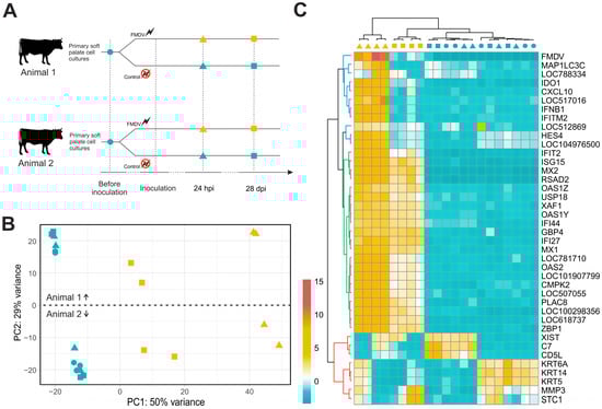 The polyadenylated RNA fraction from 21 primary bovine SP cell culture samples was sequenced. From these, 10 and 11 samples originated from a female and male bovine, respectively. Cells for analysis were harvested immediately before inoculation (0 hpi), 24 hpi and 28 dpi (Figure 1A). For each time point (0 hpi, 24 hpi, 28 dpi) and treatment (FMDV, control), a minimum of four biological replicates (two from each animal) was sequenced. The number of reads for each sample ranged from 21.8 to 28.0 million, with an average of 24.7 million. In total, 518.4 million reads were included in the analysis (Supplementary Table S1).