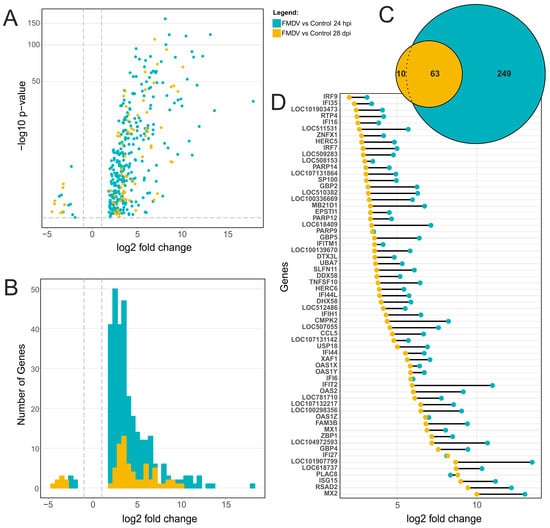 Differential gene expression of SP cells during FMDV infection. (A) Volcano plot showing the log2 fold change (x-axis) and the adjusted p-value (y-axis) for all differentially expressed genes during the acute (24 hpi, green) and persistent (28 dpi, orange) phase of FMDV infection. The log2 fold change and adjusted p-value are calculated relative to a non-infected control from the same time point. The grey dotted lines indicate the cutoff values: adjusted p-value < 0.001 and |log2 fold change| > 1. (B) The histogram summarizes the number of genes that have a certain log2 fold change. (C) The total number of differentially expressed genes is visualized in a Venn diagram. The overlap indicates the 63 genes that are differentially expressed during both phases of infection. (D) The log2 fold change of these 63 genes is compared for acute and persistent infection.