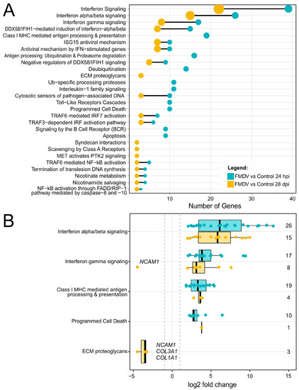 Pathway enrichment analyses of significantly differentially expressed genes during acute and persistent FMDV infection of bovine soft palate cells. (A) The number of genes that contribute to a significantly enriched Reactome pathway is shown for 24 hpi (blue dots) and 28 dpi (orange dots). Black lines connect pathways that are enriched in both datasets and the size of the circles represents the ratio of genes found for a certain pathway to the overall gene number. (B) The log2 fold change of genes that contribute to selected enriched Reactome pathways are highlighted (24 hpi—blue dots) and 28 dpi—orange dots). The grey dotted lines indicate a |log2 fold change| > 1. The numbers on the right correspond to the number of genes associated with each pathway.