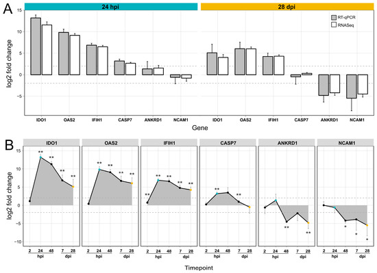 Expression analysis for selected genes by RT-qPCR at different time points. (A) Gene expression in FMDV infected soft palate cells compared to uninfected controls, at 24 hpi (blue panel) and 28 dpi (orange panel). The change in gene expression was analyzed for six selected target genes and two reference genes (not shown) using RT-qPCR. Log2 fold changes were calculated in comparison to a non-infected control from the same time points. Grey and white bars indicate the log2 fold change of gene expression using results from RT-qPCR and RNA sequencing (RNASeq), respectively. The grey dotted lines indicate a |log2 fold change| > 1. (B) The gene expression of the six selected genes was traced in a time course 2, 24, and 48 hpi; and 7 and 28 dpi. Statistically significant changes in comparison to control samples are highlighted with asterisks (p-value < 0.05: *; p-value < 0.01: **). Time points 24 hpi and 28 dpi are illustrated in blue and orange, respectively.