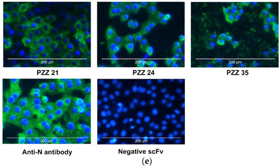Since the pET-28a(+) vector contains (His)6-tags at both N- and C-termini, these scFvs were further purified using Ni-NTA His binding resin. SDS-PAGE indicated that the scFvs were successfully purified in a soluble and correct folding form (Figure 1c). The molecular weight of the purified protein was ~28 kDa, which corresponded to the predicted size. Purified scFv protein was also subjected to western blotting. The results showed that purified scFvs reacted with mouse anti-His tag antibody (Figure 1d). To confirm whether purified scFv specifically bound to PEDV, an IFA assay was performed. The result showed that PZZ 21, PZZ 24 and PZZ 35 stained PEDV-infected Vero E6 cells but did not react with uninfected control cells, indicating that purified scFv specifically bound to PEDV (Figure 1e).