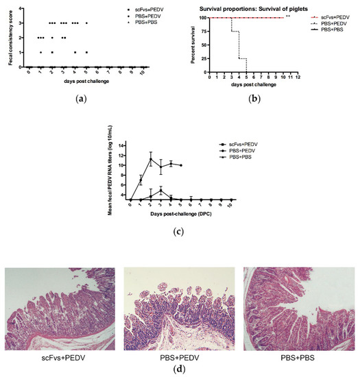 Evaluation of the prophylactic efficiency of scFvs in piglets challenged with prevalent PEDV. (a) After challenge with PEDV, the fecal consistency scores were recorded daily. Each dot indicates the score of an individual piglet at different days post-challenge (dpc). The fecal consistency was scored as follows: 0, normal feces; 1, pasty feces; 2, semiliquid feces; 3, liquid feces. (b) Piglets orally administered scFvs survived after PEDV infection. Animal survival was observed for 10 dpc. The log-rank (Mantel–Cox) test was used to calculate statistical differences between each group, and p < 0.01 was considered a significant difference. (c) Fecal samples were collected using cotton swabs and used to extract viral RNA. Quantitative real-time PCR was performed using primers targeting the PEDV N gene. The detection limit was 3 log10 copies/mL, and values lower than the detection limit were considered to denote negative samples. (d) Small intestinal tissues were collected from piglets at 5 dpi. The tissues were fixed in 10% formalin, embedded in paraffin and stained with hematoxylin and eosin (H&E). The stained sections were observed by light microscopy at 400× magnification.