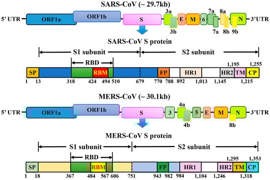 Coronaviruses are the largest kind of positive-strand RNA viruses (26–32 kb) as they are about 125 nm in diameter [], and comprise four genera (alpha-, beta-, gamma-, and delta-coronavirus) []. Currently, six human CoVs (HCoVs) have been confirmed: HCoV-NL63 and HCoV-229E, which belong to the alpha-coronavirus genus; and HCoV-OC43, HCoV-HKU1, SARS-CoV, and MERS-CoV, which belong to the beta-coronavirus genus. SARS-CoV and MERS-CoV are the two major causes of severe pneumonia in humans and share some common coronavirus structural characteristics. Similarly, their genomic organization is typical of coronaviruses, having an enveloped, single, positive-stranded RNA genome that encodes four major viral structural proteins, namely spike (S), envelope (E), membrane (M), and nucleocapsid (N) proteins 3–5, that follow the characteristic gene order [5′-replicase (rep gene), spike (S), envelope (E), membrane (M), nucleocapsid (N)-3′] with short untranslated regions at both termini (Figure 1). The viral membrane contains S, E, and M proteins, and the spike protein plays a vital functional role in viral entry. The rep gene encodes the non-structural protein and constitutes approximately two-thirds of the genome at the 5′ end. In detail, the S protein is in charge of receptor-binding and subsequent viral entry into host cells, and is therefore a major therapeutic target [,]. The M and E proteins play important roles in viral assembly, and the N protein is necessary for RNA synthesis.