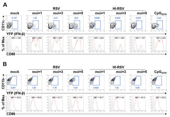 In addition, costimulatory molecule expression was increased in RSV-stimulated BM-DCs and BM-DMs, but heat-inactivated RSV had limited ability to induce IFN-β and expression of costimulatory molecules in BM-DCs, while the induction of IFN-β is slightly increased in heat-inactivated RSV-treated BM-DMs. Taken together, we confirmed previous reports that DCs and MACs are type I IFN-producing cells on RSV infection, by using IFN-β/YFP reporter mice; additionally, we found that DCs produce more type I IFN than do MACs. Moreover, we revealed that maturation of DCs is RSV replication-dependent.