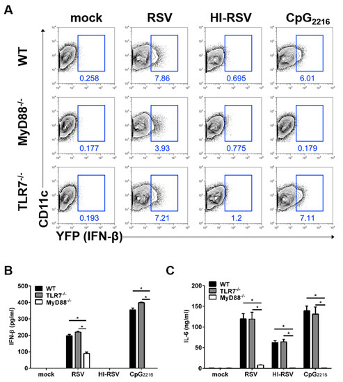 In this study, we investigated the requirement for TLR7, MyD88, and MAVS in innate immune responses in DCs and MACs in response to RSV infection. Our results showed that MyD88 and MAVS play important roles in the production of type I IFN in both DCs and MACs in response to RSV infection. Type I IFN is critical for inducing lung inflammation in response to RSV infection in mice. However, type I IFNs are especially difficult to detect because of their transient expression. To overcome this problem, we utilized two reliable methods in this study. First, we used the IFN-β/YFP reporter mouse, a credible and unbiased tool for the visualization and spatiotemporal tracking of IFN-β-producing cells. We also confirmed the results of flow cytometric data at the protein level by IFN-β ELISA. These results allowed us to clearly understand whether TLR7, MyD88, and MAVS were required in the production of type I IFN and pro-inflammatory cytokine in DCs and MACs during RSV infection.