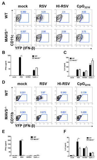 Recent studies demonstrate that the intracellular RNA sensor RIG-I/MDA5 is required for RSV sensing and triggers innate immune responses [11,22]. Both receptors use MAVS on mitochondria for activation of downstream signal transduction. To investigate MAVS dependency in type I IFN in DCs and MACs against RSV infection, BM-DCs and BM-DMs were generated from MAVS-deficient IFN-β/YFP reporter mice. MAVS-deficient BM-DCs and BM-DMs showed impaired induction of IFN-β production upon RSV stimulation, and this effect was RSV replication-dependent (Figure 4A,D).