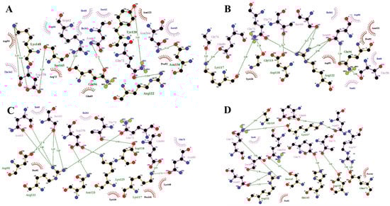 LIGPLOT prepared interacting residues in the TLR5_SGD58 complex. (A–D) represent the best structures of the TLR5_SGD58 cluster. The color-coding represents the TLR5 in brown color and the SGD58 in pink color. The dashed lines in green color denote hydrogen-bonding interactions.