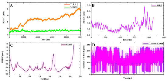 MD simulation demonstrated the stability of the TLR5_SGD58 docked complex in the active site of TLR5. RMSD is the known parameter by which to determine the obtained structure from the MD trajectory. This parameter was evaluated as a preliminary analysis of the backbone atoms of TLR5. The structure and dynamic proprieties of TLR5 were determined using the backbone RMSDs during the simulation period (Figure 4). The RMSD of TLR5 was gradually increased until 20 ns and a nearly 8–100 ns period with 3–4 nm of deviation, and after 30–80 ns, it was stable. The RMSD curve of SGD58 indicates an insignificant variation from 0–20 ns at 5.0 nm, and after 20 ns, it was stable. SGD58 has more a stable RMSD value compared to TLR5 (Figure 4A). The flexibility of each residue in the TLR5-SGD58 complex is calculated based on root mean square fluctuations (RMSF). Figure 4B shows that TLR5 has an insignificant variation of residues, which indicates that this molecule was stable during the MD simulation time of 100 ns. These residues have well-known interactions with the vaccine candidate. The ND1b domain (100–200 residues) of the Flagellin fragments of SGD58 shows a low flexibility, which can be attributed to their interaction with the TLR5 protein (Figure 4C). In addition, CD1 and CD0 domains have more fluctuations (200–250 residues). Figure 4D illustrates hydrogen bond interactions throughout the simulation period, to understand the binding efficiency of TLR5 with SGD58. The average number of hydrogen bond interactions was observed in 2.0 nm. Figure S3 illustrates that the potential energy (PE), temperature, total energy (TE), and pressure of SGD58 was stable during the simulation period. The average TE of SGD58 is −7207307343.324 with a standard deviation of 4279.598082. In addition, the average PE of SGD58 is −8985342.697 with a standard deviation of 3370.264894. PE and TE attained equilibrium at a temperature of 300K. The result of the radius of gyration (Rg) analysis is shown in Figure S4. The simultaneous changes in the Rg plots of the complex with TLR5 (Figure S4a) and SGD58 (Figure S4b) indicate that the substantial nature of the complex frequently increases. The Rg plots compression of SGD58 with TLR5 is similar to the RMSD parameter, which indicates the effort of SGD58 to reach internal configuration in TLR5.