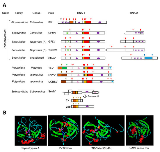 Chymotrypsin-like cysteine or serine proteases. (A) Genomic organization of representative viruses. Polyproteins are shown by boxes with cleavage sites indicated by vertical lines. Protease domains are shown in red for chymotrypsin-like 3C or 3CL cysteine proteases, brown for chymotrypsin-like serine proteases, green for papain-like cysteine proteases, and blue for glutamic proteases. The two shades of brown in the polyprotein of potyvirids represent P1 serine proteases of type A (light brown) or type B (dark brown). The same color code is used for arrows above each cleavage site indicating the protease responsible for the cleavage. A black arrow in the PV polyprotein indicates an autocatalytic maturation cleavage event of the capsid protein. Orange boxes indicate the VPg proteins. Purple ovals represent the conserved picorna-like RdRp domain. Stars indicate coat protein domains: purple for the three picorna-like type 1 jelly-roll domains (which can be divided into one, two, or three CPs, depending on the genera), pink for type 2 jelly-roll domains, and blue for CPs forming filamentous virions. Helicase domains are shown by the triangles: purple for superfamily 3 helicases and pink for superfamily 2 helicases. The protease co-factor motif of CPMV is shown by a small green square. This motif is present in nepoviruses (represented by the empty green square) but does not act as a co-factor. (B) Structure of representative proteases. Catalytic residues are represented as follows. Cellular protease: chymotrypsin A from Bos taurus (pdb:1CBW_ABC) His57 (purple), Asp102 (pink), Ser195 (orange), human virus protease: PV 3C-Pro (pdb: 1L1N_A): His1603 (purple), Glu1634 (blue), Cys1710 (yellow) and plant virus proteases: TEV NIa 3CL-Pro (pdb: 1LVM): His2083 (purple), Asp2118 (pink), Cys2188 (yellow), and SeMV serine Pro (pdb: 1ZYO): His181 (purple), Asp216 (pink), Ser284 (orange). Images of protease structures are reprinted with permission from the MEROPS database (www.ebi.ac.uk/merops). PV: poliovirus, CPMV: cowpea mosaic virus, GFLV: grapevine fanleaf virus, ToRSV: tomato ringspot virus, SMoV: strawberry mottle virus, TEV: tobacco etch virus, CVYV: cucumber vein yellowing virus, UCBSV: Ugandan cassava brown streak virus, SeMV: sesbania mosaic virus.