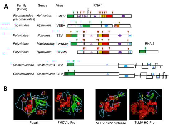 Papain-like cysteine proteases. (A) Genomic organization and proteolytic cleavages of representative viruses. Polyproteins are shown by boxes with cleavage sites indicated by vertical lines. Protease domains are shown in green for papain-like cysteine proteases, red for chymotrypsin-like 3CL cysteine proteases and brown for chymotrypsin-like serine proteases. The same color code is used for arrows above each cleavage site indicating the protease responsible for the cleavage. A black arrow in the foot-and-mouth disease virus (FMDV) polyprotein indicates an autocatalytic maturation cleavage event of the capsid protein. The “ngpg” sequence represent the 2A translational stop-go sequence of FMDV. Orange boxes indicate the VPg proteins. Ovals represent RdRp domains: purple for picorna-like RdRp and blue for alpha-like RdRp. Stars indicate the coat protein domains: purple for picorna-like type 1 jelly-roll domains icosahedral coat protein, red for unrelated icosahedral CP of togaviruses, blue for filamentous coat proteins. Helicase domains are shown by the triangles: light blue, pink and purple for helicase superfamilies 1, 2, and 3, respectively. Please note that cleavage sites processed only by viral proteases are shown. The VEEV cleavage sites processed by the cellular furin protease are not shown. (B) Structure of representative proteases. Catalytic residues are represented, as follows; Cellular protease: papain from Carica papaya (pdb: 1PE6, in complex with E-64 inhibitor, which is shown in grey): Cys158 (yellow), His292 (purple), Asn308 (pink), animal virus proteases: FMDV L-Pro (pdb: 1QMY_A: mutant protease with Cys51 mutated to Ala), Cys51 (yellow, mut. to Ala), His148 (purple), Asp163 (pink), and VEEV nsP2 protease (pdb: 2HWK, only the protease catalytic domain is shown): Cys477 (yellow), His546 (purple), and plant virus protease: TuMV HC-Pro (pdb: 3RNV, protease catalytic domain): Cys706 (yellow), His779 (purple). Images of protein structures are reprinted with permission from the MEROPS database (www.ebi.ac.uk/merops). FMDV: foot-and-mouth disease virus, VEEV: Venezuelan equine encephalitis virus, TEV: tobacco etch virus, CYNMV: Chinese yam necrotic mosaic virus, BaYMV: barley yellow mosaic virus, BYV: beet yellows virus, CTV: citrus tristeza virus, TuMV: turnip mosaic virus.