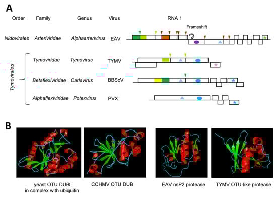 The order Tymovirales encompasses a large group of viruses related by common signatures of their replication enzymes but are otherwise quite diverse, for example, having different capsid structures and/or different movement protein modules [24]. The acquisition and evolution of protease and DUB domains to regulate the processing and stability of the replication proteins is also complex. Although members of the family Alphaflexiviridae lack a protease domain, most members of the families Betaflexiviridae encode either a single cysteine protease or tandem OTU-like and papain-like motifs (Figure 3A). Indeed, the presence of duplicated putative Cys-His dyads was already noted in the polyprotein of blueberry scorch virus (BBScV, genus Carlavirus, family Betaflexiviridae) in the early 1990s with only the C-terminal dyad implicated in polyprotein cleavage [146]. The N-terminal dyad is consistent with an OTU-like motif and may be specialized in DUB activity although this will need to be confirmed experimentally [24] (Figure 3A). It has been hypothesized that the dual Pro-DUB function of the single TYMV protease may have been derived from an original OTU-like and papain-like dyad tandem, although alternative evolution scenarios are also possible [139]. Functional and structural characterization of additional proteases from the order Tymovirales will be necessary to gain a better understanding of their evolution history.