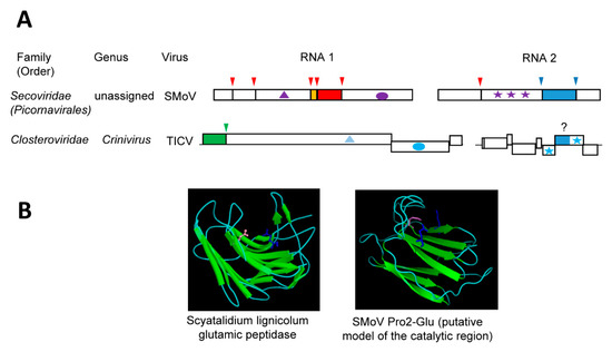 Confirmed and putative glutamic proteases. (A) Genomic organization and proteolytic cleavages of representative viruses. Polyproteins are shown by boxes with cleavage sites indicated by vertical lines. Protease domains are shown in green for papain-like cysteine proteases, red for chymotrypsin-like 3CL cysteine proteases, and blue for confirmed (SMoV) or putative (TICV) glutamic protease domain. The same color code is used for arrows above each cleavage site indicating the protease responsible for the cleavage. The orange box indicates the VPg protein. Ovals represent RdRp domains: purple for picorna-like RdRp and blue for alpha-like RdRp. Stars indicate the coat protein domains: purple for picorna-like type 1 jelly-roll domains icosahedral coat protein and blue for filamentous coat proteins. Helicase domains are shown by the triangles: light blue and purple for helicase superfamilies 1 and 3, respectively. (B) Structure of representative proteases. Catalytic residues are represented as follows: Fungal protease: Scyatalidium lignicolum glutamic peptidase (pdb: 1S2B): Gln107 (pink) and Glu190 (blue) (Image reprinted with permission from the MEROPS database (www.ebi.ac.uk/merops)) and plant virus protease: SMoV Pro2-Glu putative model of the catalytic region, generated using Phyre2 [35]: Glu1192 and Glu1274 (blue) and Gln1180 (pink). Image of the structure model was generated using PyMol. SMoV: strawberry mottle virus, TICV: tomato infectious chlorosis virus.
