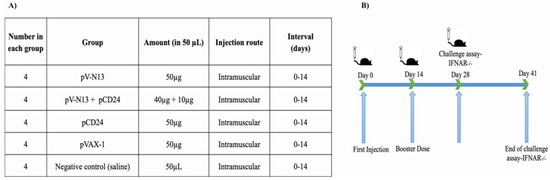 A total of twenty 8–10-week-old female BALB/c mice were randomly divided into five groups, including pV-N13, pCD24, pV-N13 plus pCD24, pVAX-1, and normal saline. All of the groups, except for the normal saline, received 50 µg of DNA constructs in a volume of 300 µL. For the pV-N13 plus pCD24 group, we previously tried different regimes ranging from 1:1 (µg) to 5:1 (µg), and the best results based on cytokine and total/specific antibody responses were obtained at 4:1 ratio (pV-N13 to pCD24). The immunization was repeated twice through the intramuscular route (thigh muscles), with an interval of two weeks. Blood samples were collected from the tail vein based on our laboratory’s routine, on days 0, 14, and 28, and the serums were used in neutralization, IIFA, cytokine, and total/specific antibody assays. In addition, the immunized mice were humanely euthanized on day 28 and the splenocytes from each individual were collected for in vitro cytokine assay (Figure 1A,B).