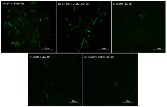During the immunization of the BALB/c mice, no signs of disease or allergy were recorded in all of the groups. The pCD24 construct induced the highest level of total antibody isotypes among the study groups, except for IgM, which was significantly elevated in the pV-N13 plus pCD24 group. The pV-N13 plus pCD24 and pV-N13 groups showed a relatively significant amount of IgG1, IgG2a, IgG2b, and IgG3 antibodies (Figure 3A–E). The IgG2a/IgG1 ratio was also determined and demonstrated to be <1 in all groups of BALB/c mice, except the saline control, which indicates a shift to the Th2 response because of the immunization schedule (Figure 3F). In IIFA, the serum samples (day 28) from the BALB/c groups of pV-N13 and pV-N13 plus pCD24 were observed to bind the stably expressed N in BHK-N cells (Figure 3G–H). Despite the high amounts of antibodies produced, all of the serum samples of both mice models subjected to VNA revealed a lack of neutralizing activity at 14- and 28-days post immunization.