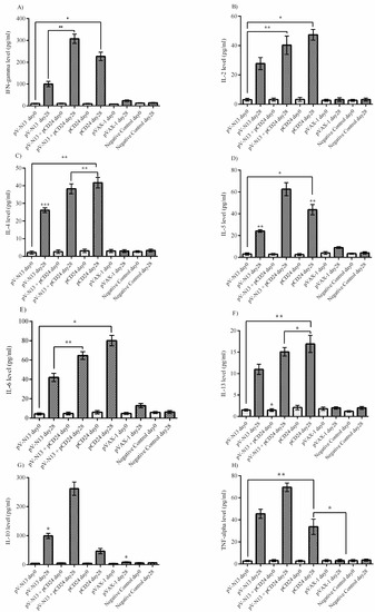 Cytokine responses in the serum samples of the immunized BALB/c mice. (A) IFN-gamma response: pCD24 vector (on day 28) stimulated a prominent production of IFN-gamma. pV-N13 plus pCD24 on day 28 is by far dominant when compared with other groups. (B) IL-2 response: pCD24 and pV-N13 plus pCD24 possessed the highest amount. Moreover, the IL-2 level in the pV-N13 group is also adequate. (C) IL-4 response: IL-4 stimulation in pCD24 and pV-N13 plus pCD24 is considerable when compared with the other groups. (D) IL-5 response: Interestingly, the pV-N13 plus pCD24 group has potential to stimulate this cytokine in immunized mice in a higher level compared to the remaining groups. The amount of IL-5 in the pCD24 immunized mice is also significantly elevated. (E) IL-6 response: pCD24 and pV-N13 plus pCD24 immunized mice possessed the highest level of IL-6 in the serum samples. (F) IL-10 response: The results indicated the predominance of the pV-N13 plus pCD24 group. (G) IL-13 response: The resu lts are comparable to those of IFN-gamma. (H) TNF-alpha response: pV-N13 plus pCD24 construct stimulated the highest levels of TNF-alpha. * p < 0.05; **p < 0.01, and *** p < 0.001 versus pVAX-1 group. All of the data are shown as mean ± SD.