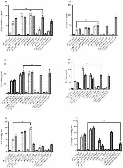 In the challenged IFNAR−/− mice serum samples, the IFN-gamma level in the pV-N13 plus pCD24 and pCD24 groups are elevated on day 28. In addition, the IFN-gamma is also significantly stimulated in the pV-N13 group after challenge with Ank-2 strain (Figure 6A). The pV-N13 plus pCD24, pV-N13, and pCD24 groups have further demonstrated a marked potential for IL-2 and IL-4 stimulation. Among these groups, the pV-N13 plus pCD24 is predominant in IL-2, as well as IL-5 secretion (Figure 6B,C). Moreover, the pV-N13 and pCD24 groups also have relatively increased IL-5 levels in the sera (Figure 6D). Furthermore, in the IFNAR−/− mice, the pV-N13 plus pCD24 and pV-N13 groups reveal an elevation of IL-6 (Figure 6E). Also, the pV-N13 plus pCD24 and pV-N13 groups are predominant in the TNF-alpha in comparison to other mice groups (Figure 6F).