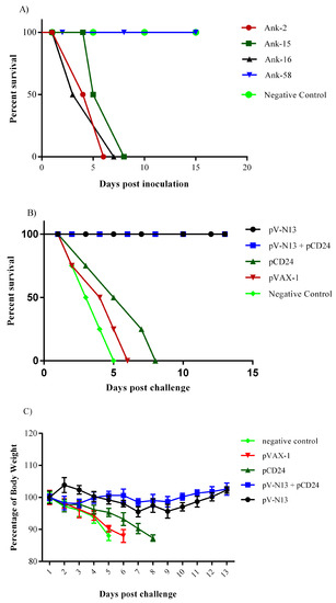 Challenge experiment. (A) Challenge assay to find the suitable strain of CCHFV: Four different isolates were assayed in IFNAR−/− to identify the lethal strains. (B) Survival rate in the challenge assay with Ank-2 strain: the pV-N13 and pV-N13 plus pCD24 groups survived in the lethal dose challenge of the IFNAR−/− mice. (C) Percentage of body weight: Despite the lethal challenge, the pV-N13 and pV-N13 plus pCD24 groups showed an almost stable body weight range. All of the data are shown as mean ± SD.